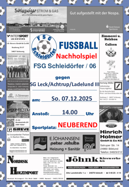 FSG Schleidörfer/06 gegen SG Leck/Achtrup/Ladelund III am So. 07.12.2025 um 14.00 Uhr in NEUBEREND