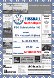 Nachholspiel FSG Schleidörfer/06 gegen TSV Hattstedt III (9-er) am Fr. 06.03.2026 um 19.30 Uhr in NEUBEREND